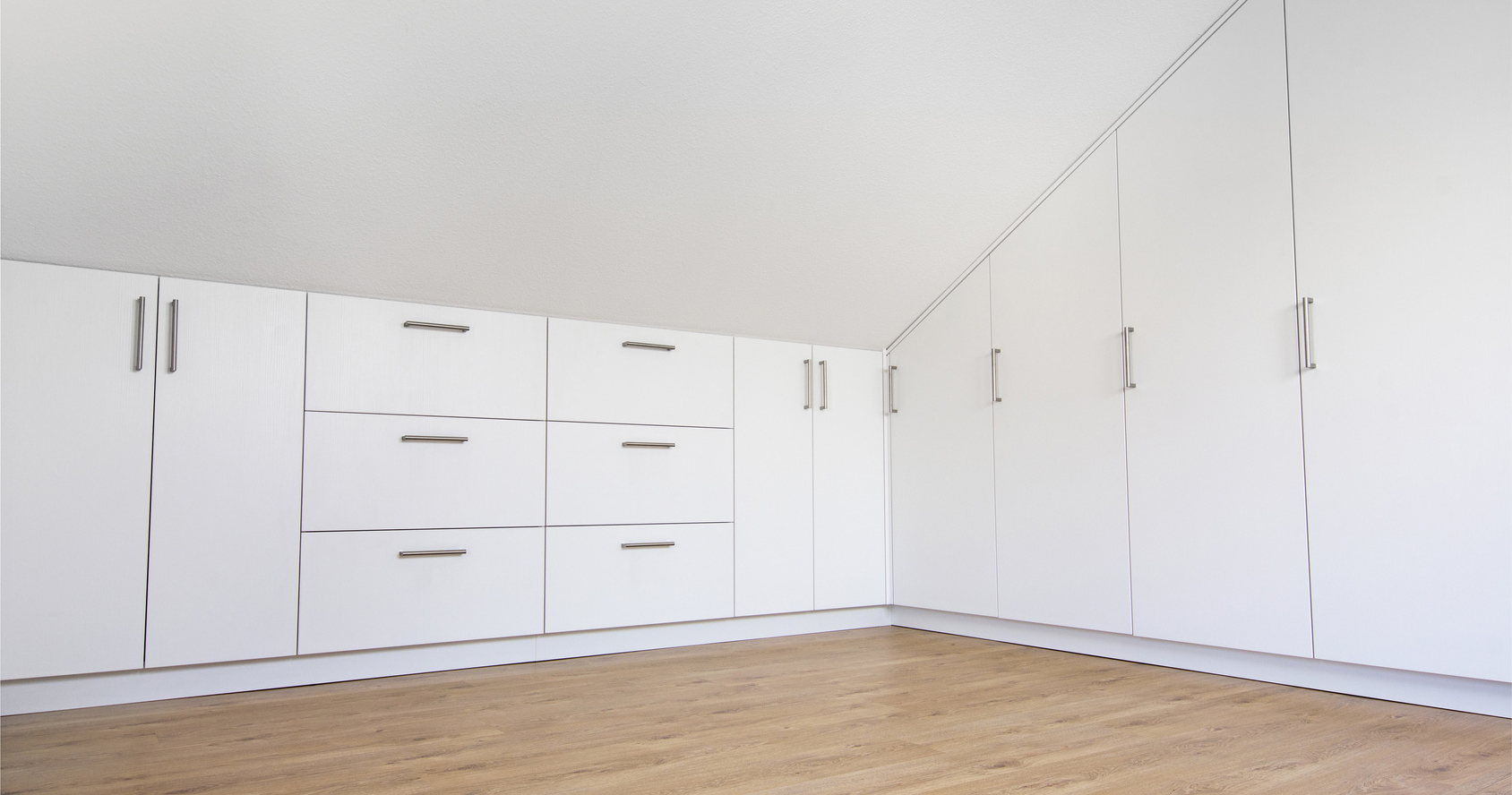 Einbauschrank, Schräge, Schrank, Dachschräge, Tischler, einbauen, Holz, Wand, passgenau, modern, Einbauschränke, niemand Ecke Raum, Möbel, Inneneinrichtung hell griffe Wohnraum Möbeltischler Edelstahl, Qualitätsarbeit Meisterbetrieb leer nutzen Kleiderschrank, Dach Qualität Zimmer moderner innen Referenz, weiß Laminat, neu Boden edel Innenaufnahme leerstehend, Mobiliar Parkett hochwertig Anfertigung, Vermieter Spezialanfertigung Foto, wohnen, groß, komplett, Wohnung